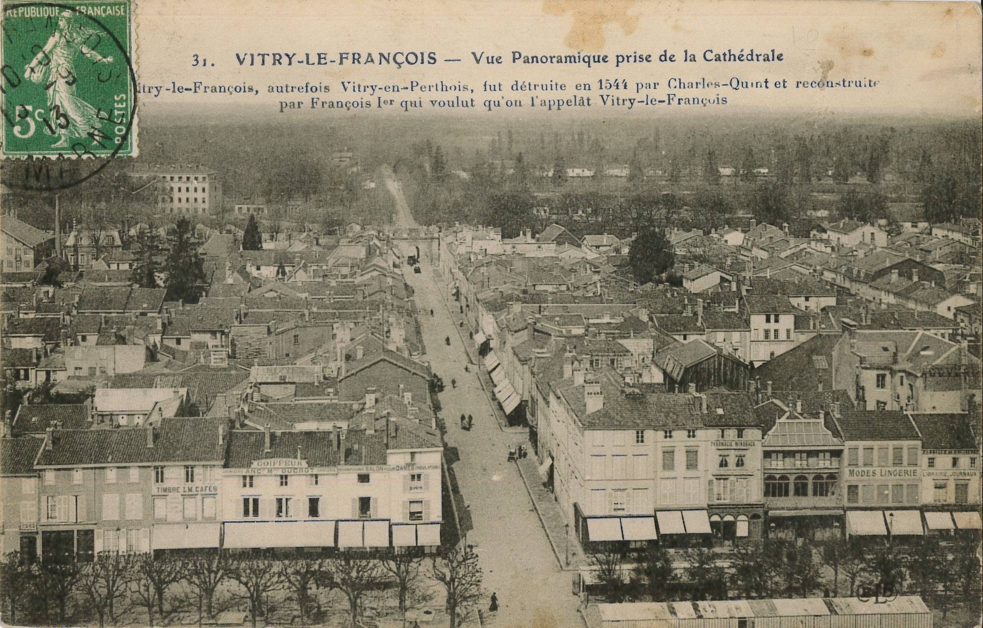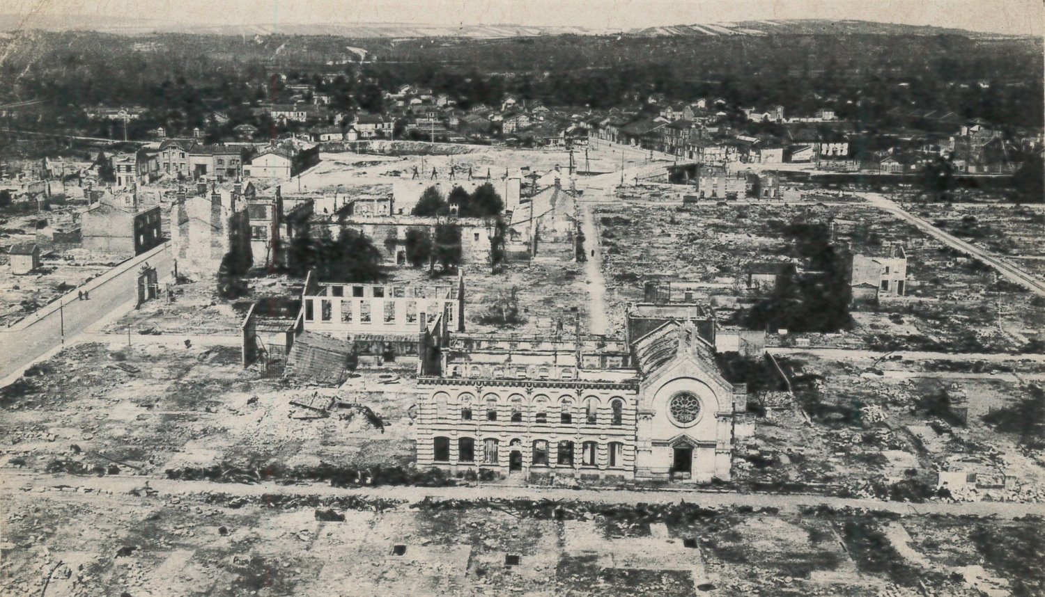 Vue depuis la collégiale vers le Nord. Elle compare la vue atuelle à celle après la destruction de la ville.